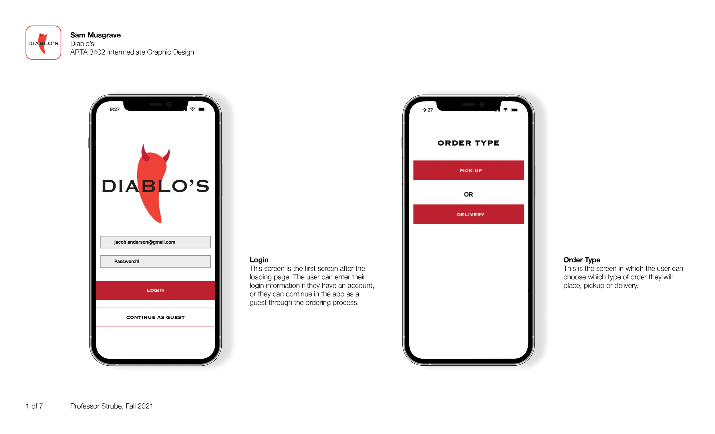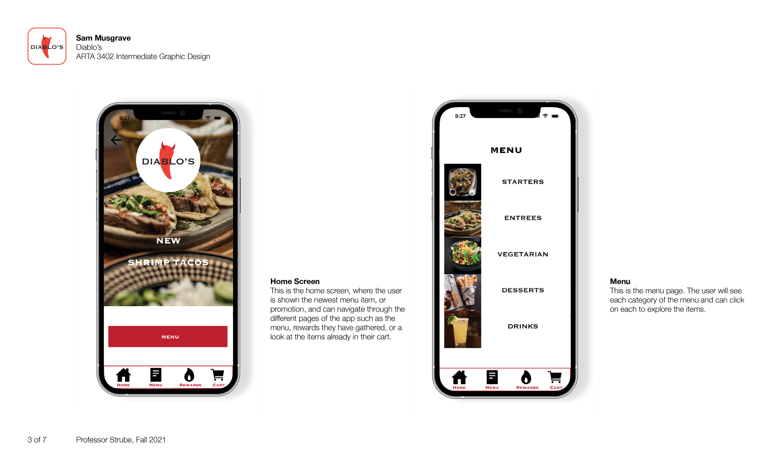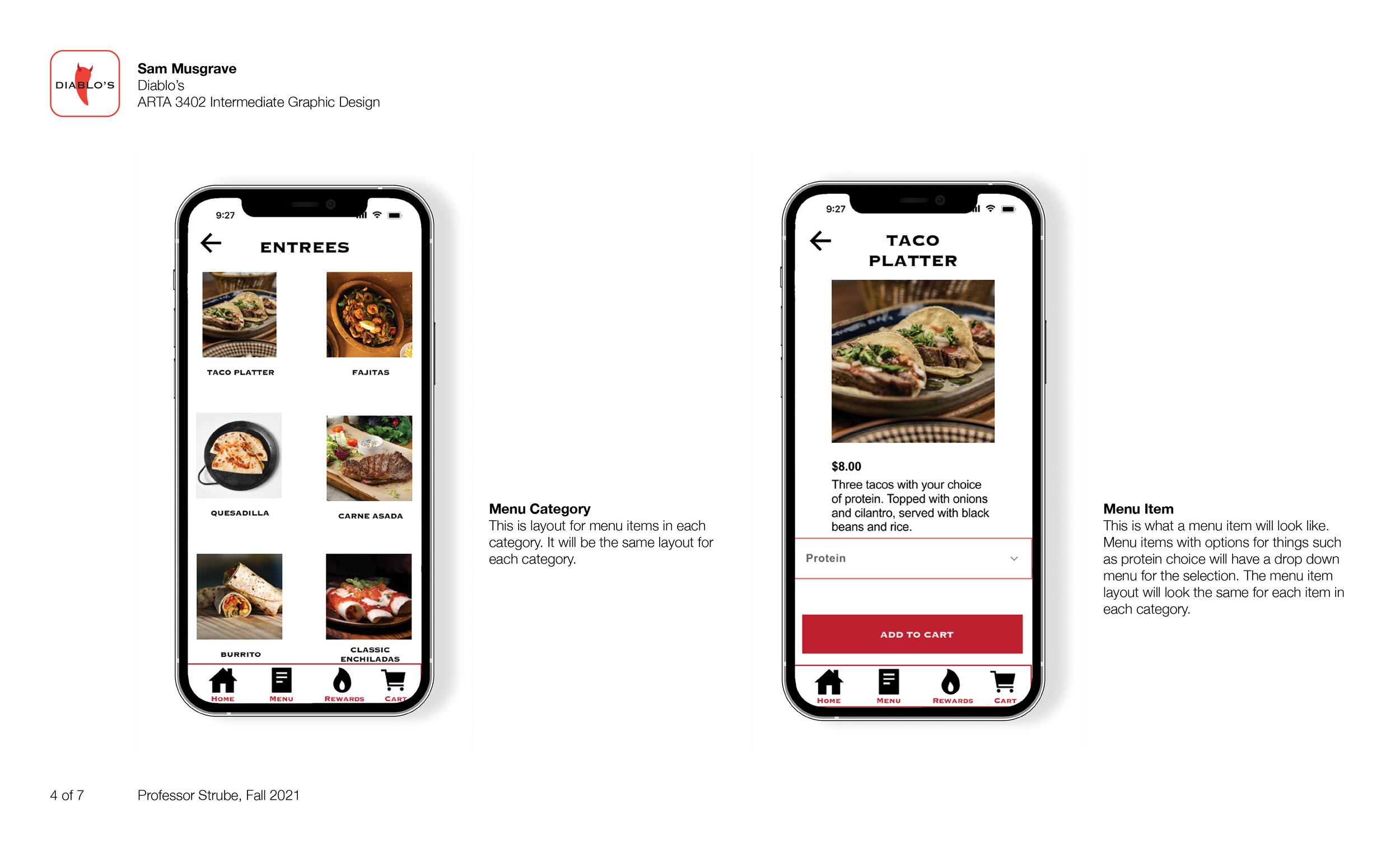 With Diablo’s I was tasked with creating a fictional restaurant with a specialty of taco’s. I was tasked with creating a logomark, a letterhead (8.5 x 11 in.), envelope, business card (2 x 3 in) and a digital and printed menu (11 x 17 in.).