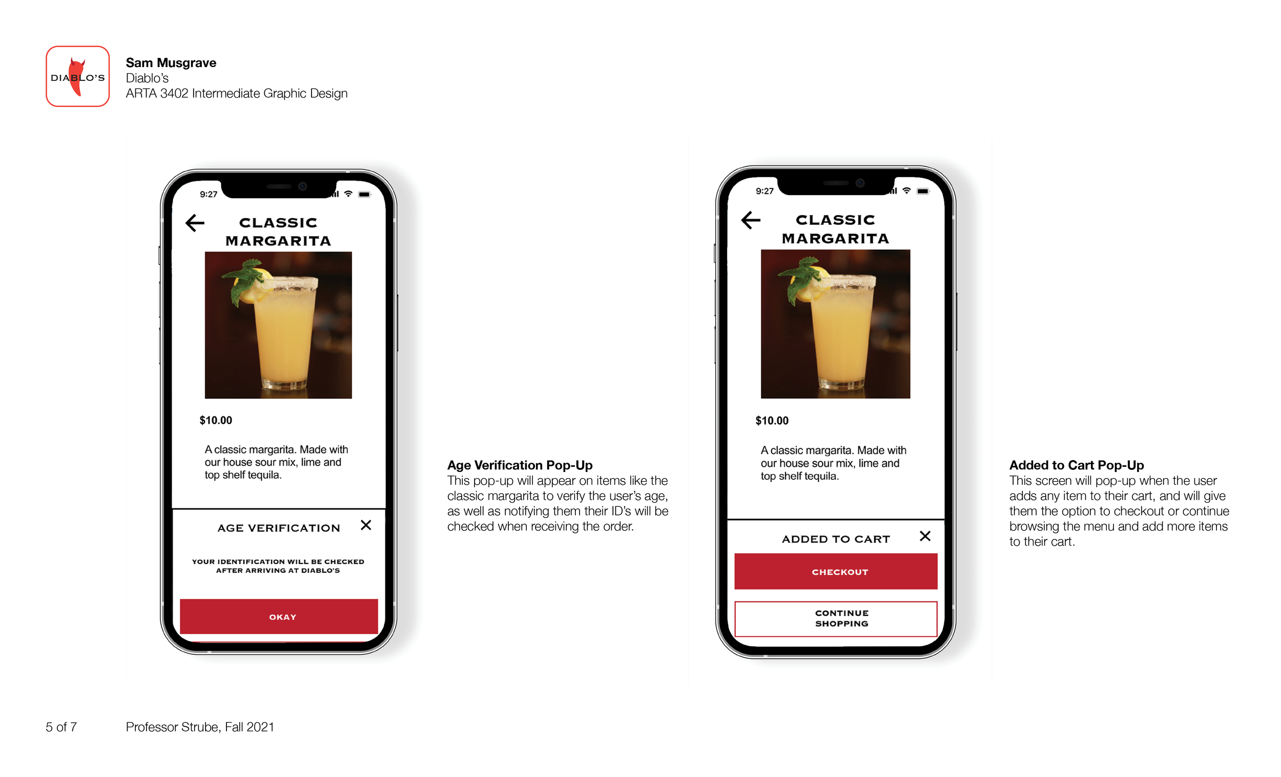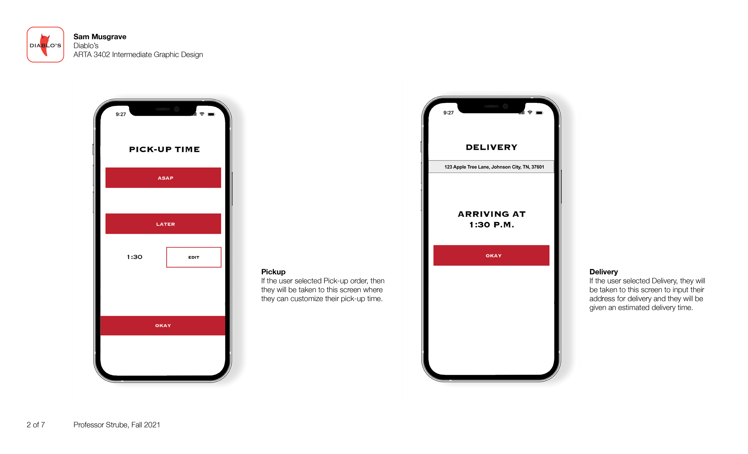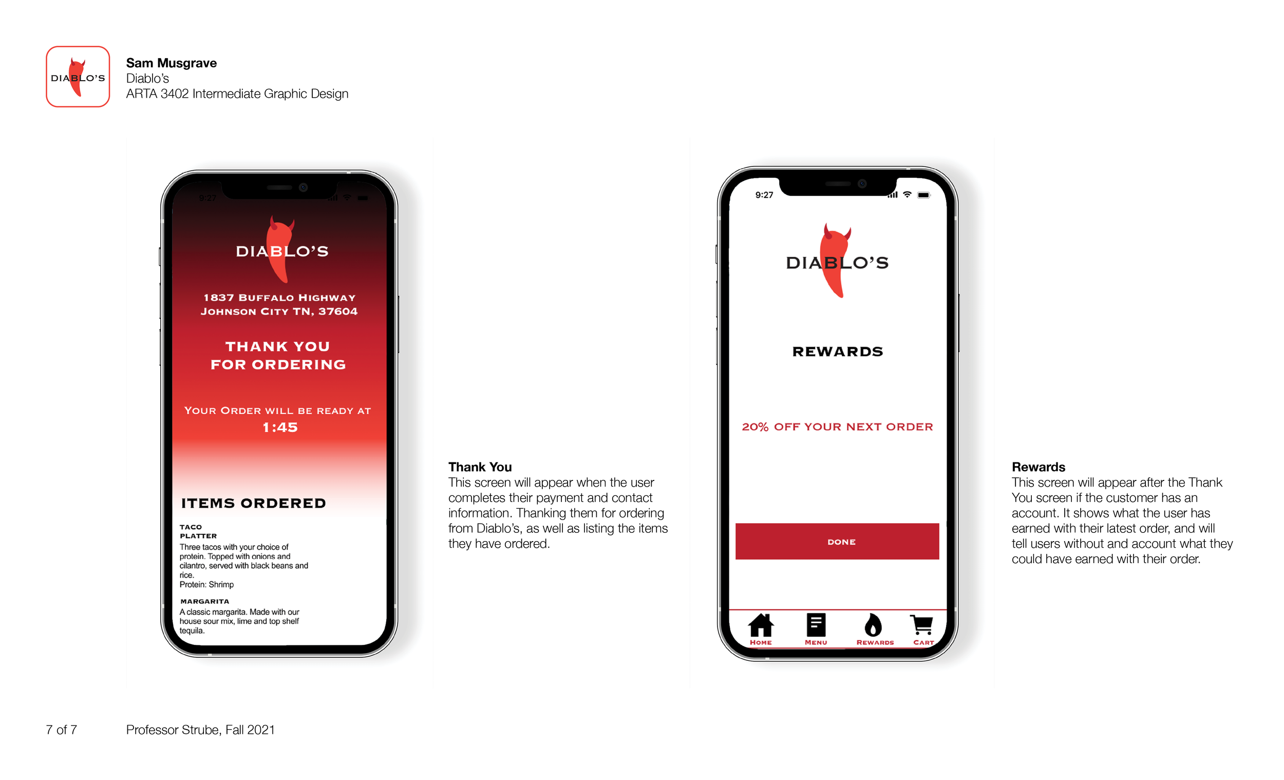 With Diablo’s I was tasked with creating a fictional restaurant with a specialty of taco’s. I was tasked with creating a logomark, a letterhead (8.5 x 11 in.), envelope, business card (2 x 3 in) and a digital and printed menu (11 x 17 in.).